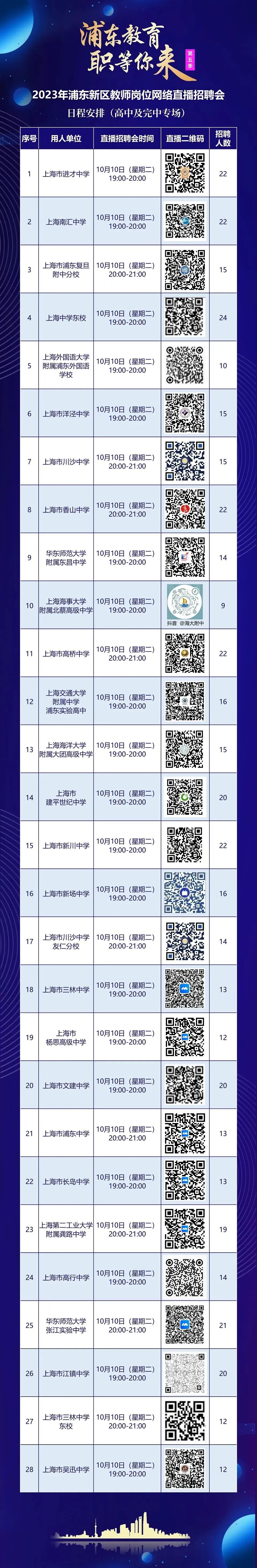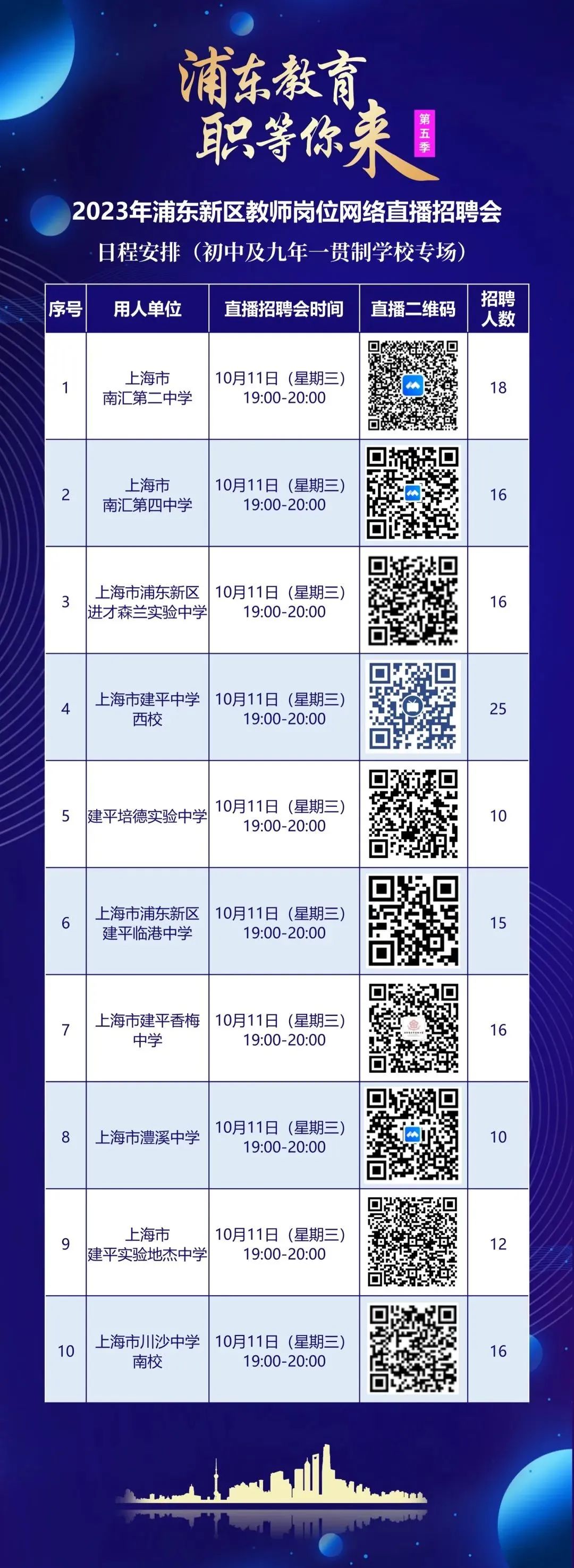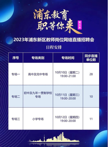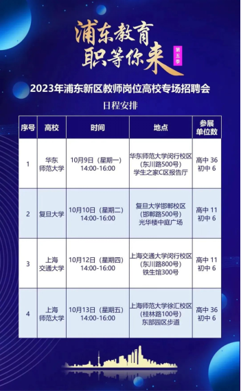 10月8日—10月13日,浦东新区教育局举办“浦东教育 职等你来(第五季)”公办学校教师岗位招聘会系列活动,正式启动2024年浦东新区公办学校第一批次教师招聘工作。