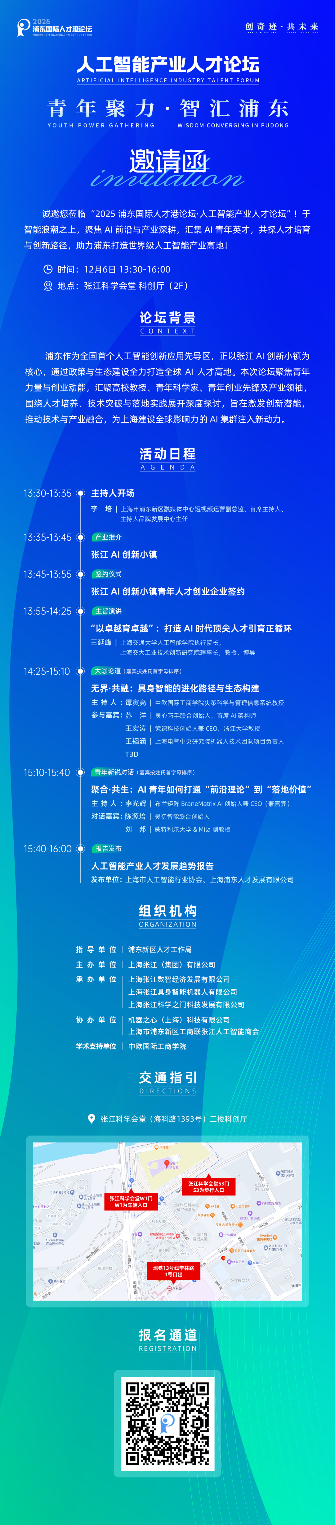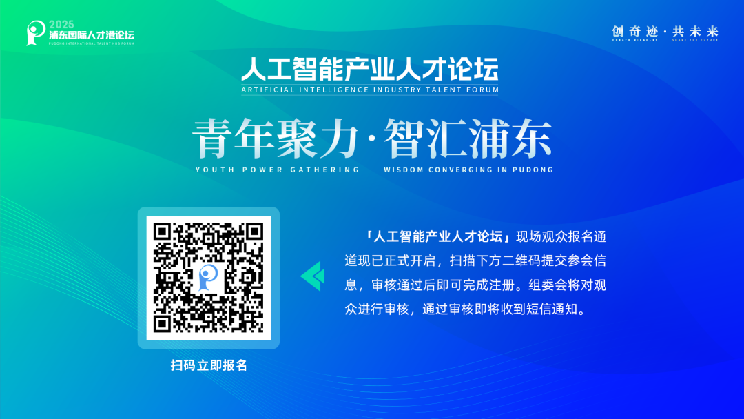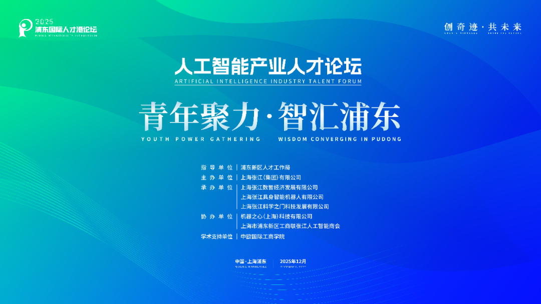 值此背景,以“青年聚力,智汇浦东”为主题的「人工智能产业人才论坛」将于12月6日下午在张江科学会堂·科创厅举办。论坛汇聚高校教授、青年科学家、青年创业先锋及产业领袖,围绕AI青年人才培养、具身智能的进化路径与生态构建、青年创业等议题展开深度探讨。此外,现场将设置张江AI创新小镇推介、企业签约仪式环节,并发布人才发展趋势报告。